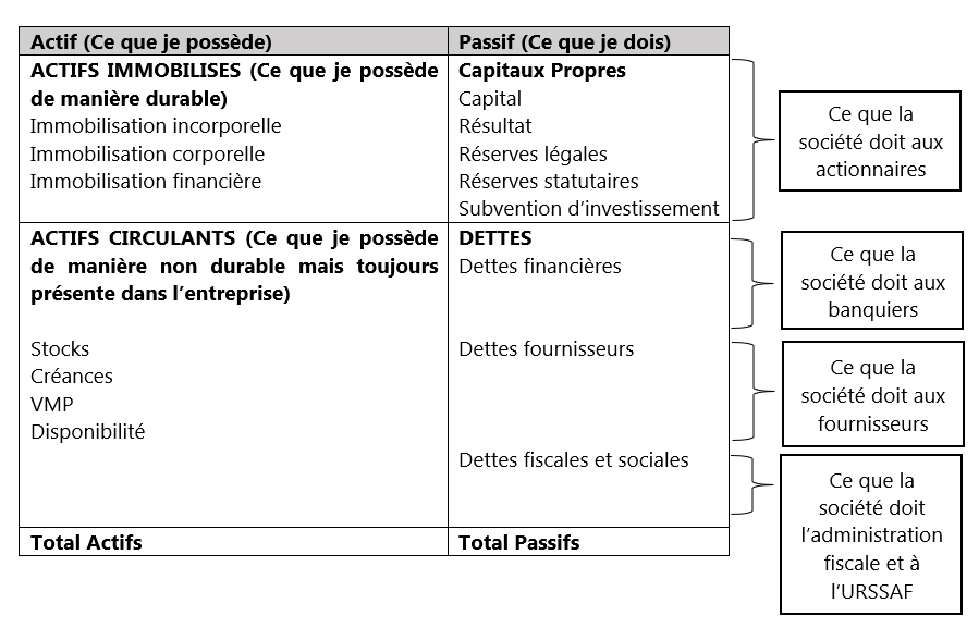 L'Actif : Il correspond à l’ensemble des biens et droits que possède une entreprise. Il est composé de l'actif immobilisé, qui inclut les éléments utilisés durablement par l'entreprise (comme les bâtiments, les équipements, etc.), et de l'actif circulant, qui inclut les éléments se renouvelant rapidement au cours du cycle d'exploitation (comme les stocks, les créances clients, etc.).
