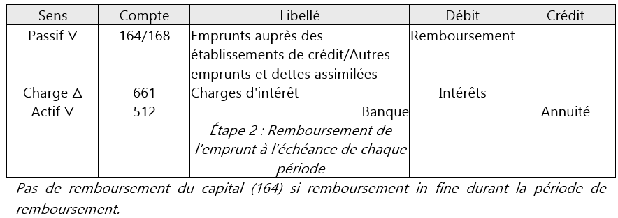 En comptabilité, un emprunt est inscrit au passif du bilan de l'emprunteur. Chaque période, un remboursement du capital et/ou des intérêts doit être effectué par l'entité.